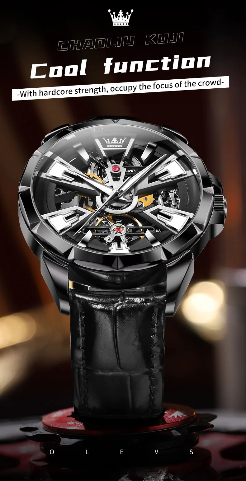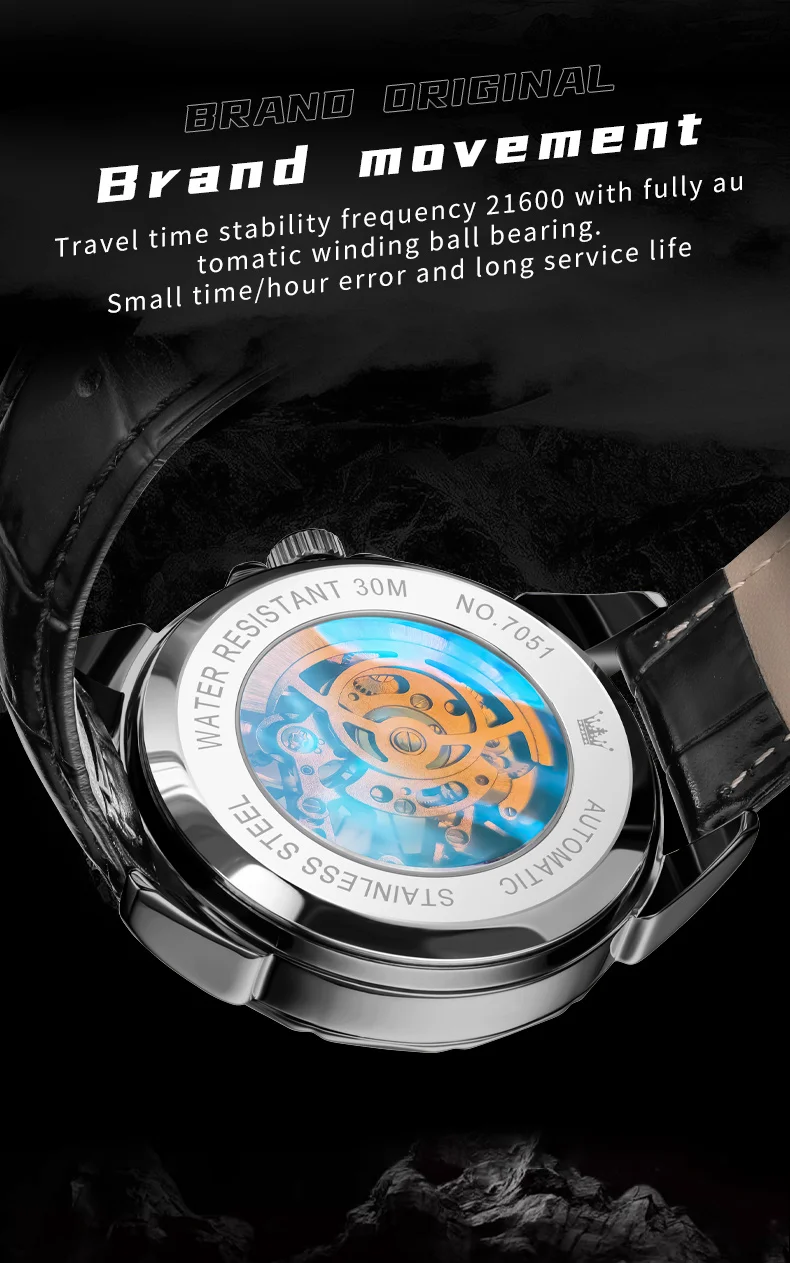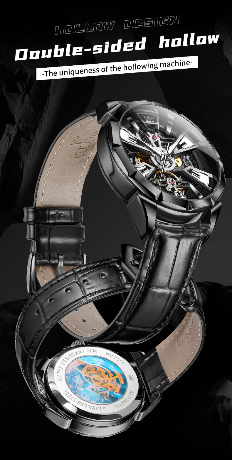 Leather Strap Waterproof Function Double-sided Hollow HD Luminous Automatic Mechanical Wristwatch for Men