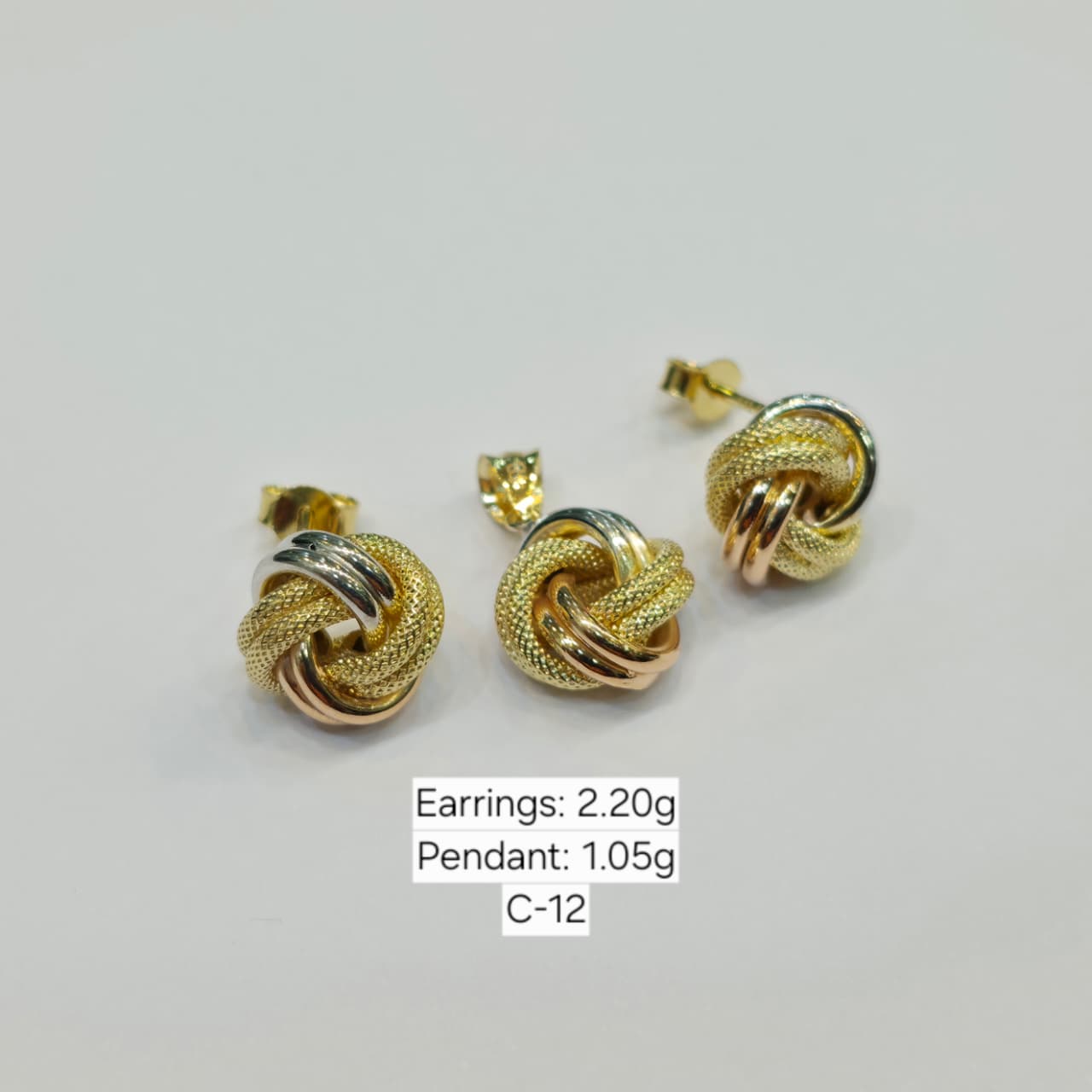 Discover the 18K gold triple color cinnamon jewelry set by Embellish Gold Jewelry. A stunning tri-tone gold pendant and earrings set, perfect for elegant occasions and gifting.